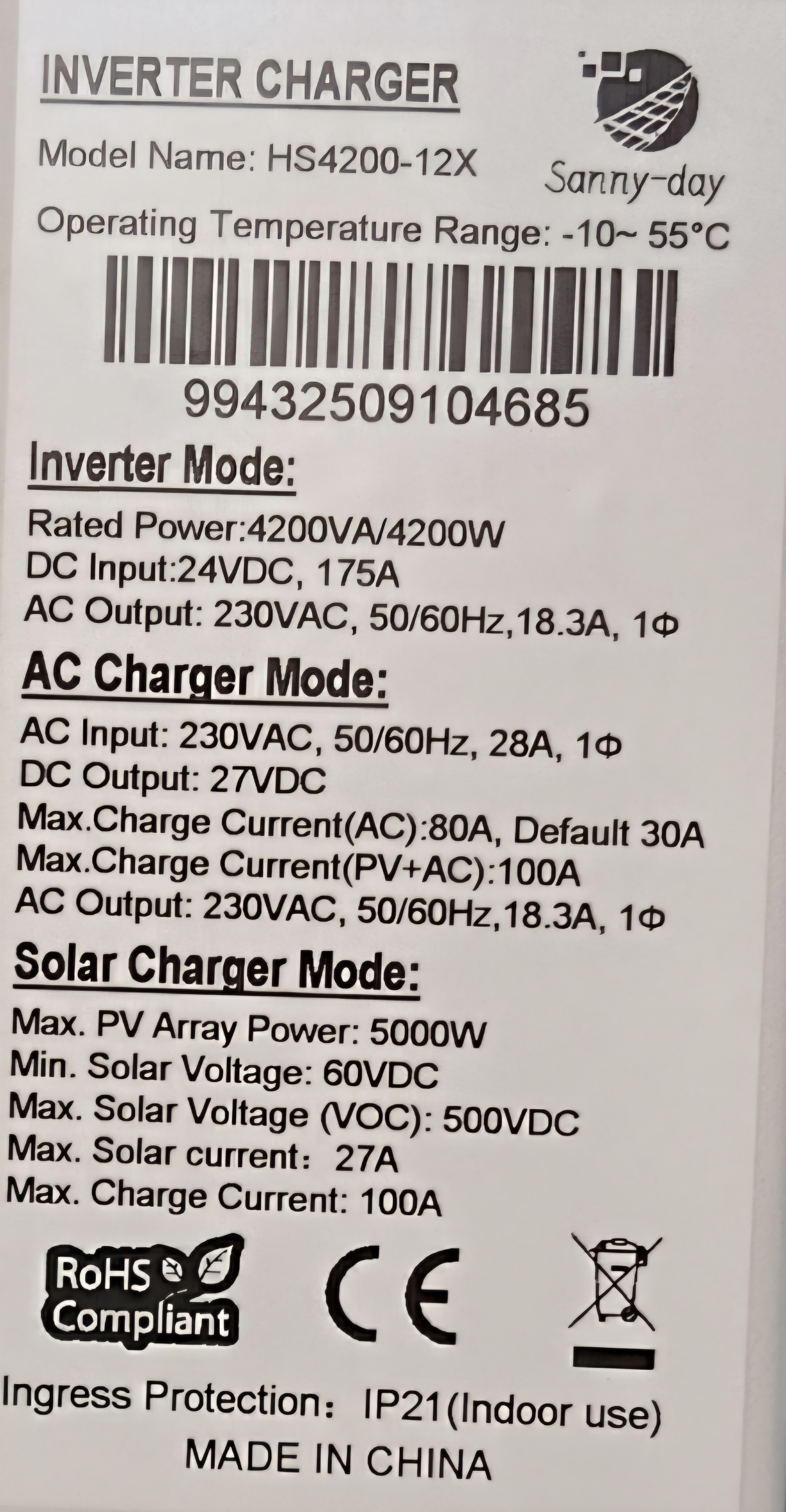 سانورتر ۴۲۰۰ وات 4.2KW برند سانی دی ۲۴ولت 100A MPPT مدل HS4200-12X